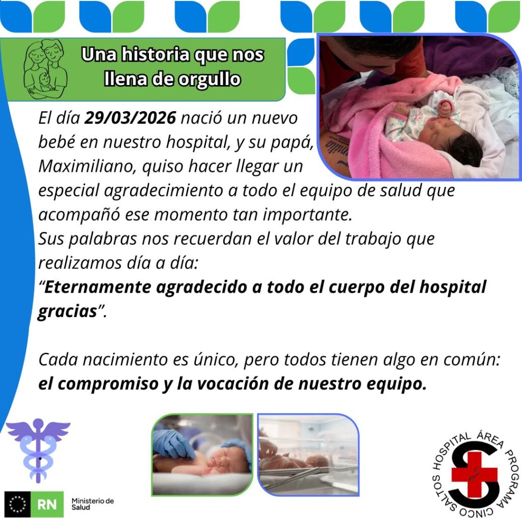 El día 29/03/2026 nació un nuevo bebé en nuestro hospital, y su papá, Maximiliano, quiso hacer llegar un especial agradecimiento a todo el equipo de salud que acompañó ese momento tan importante.