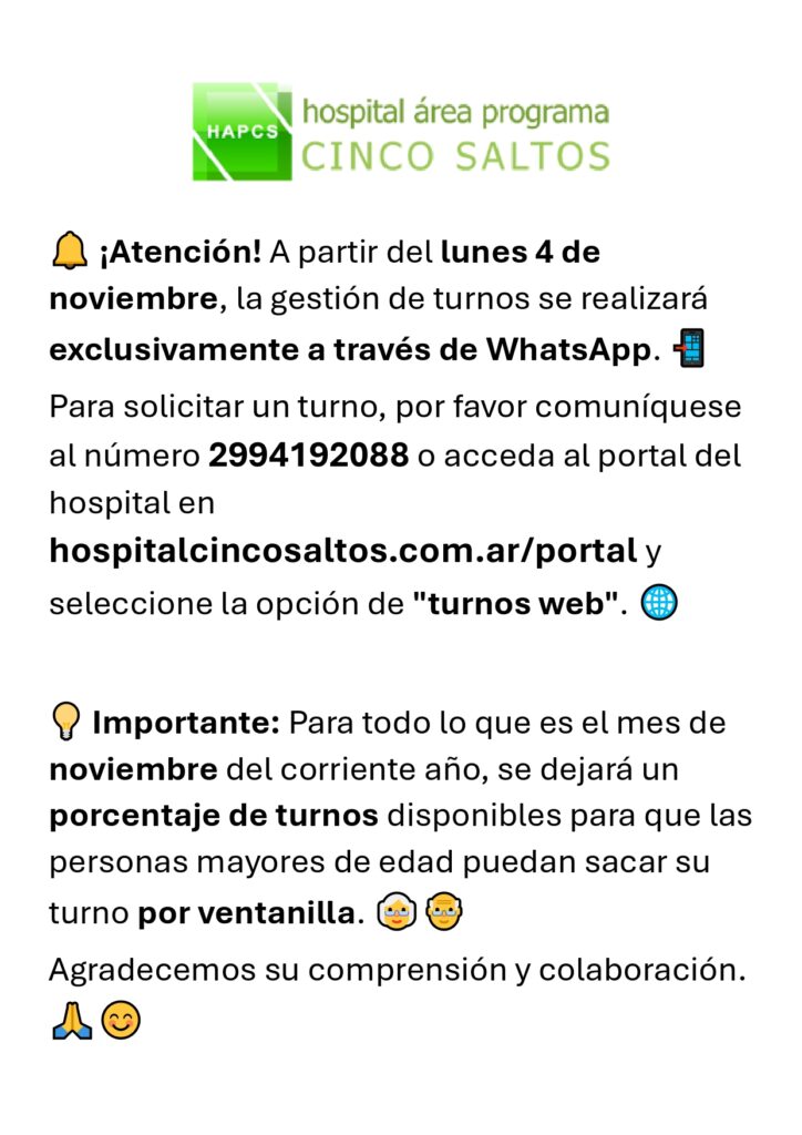 Agradecemos su comprensión y les saludamos con entusiasmo, ya que el Hospital Cinco Saltos se automatiza en la gestión de turnos para brindar mayor comodidad.